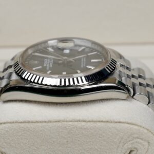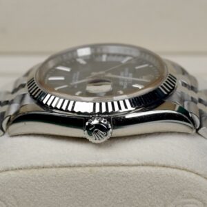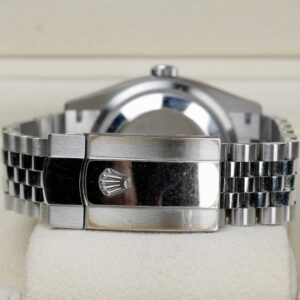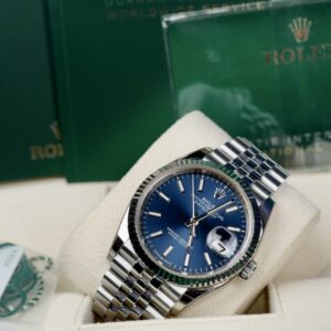 Datejust หน้ายอดนิยม โดดเด่นด้วยหน้าปัดสีน้ำเงินสว่าง ขอบหยักทำมาจากทองคำขาว 18K และสาย Jubilee ติดสติ๊กเกอร์หน้าปัดกับตัวเรือนเรียบร้อย สภาพสวยคมกริบค่ะ